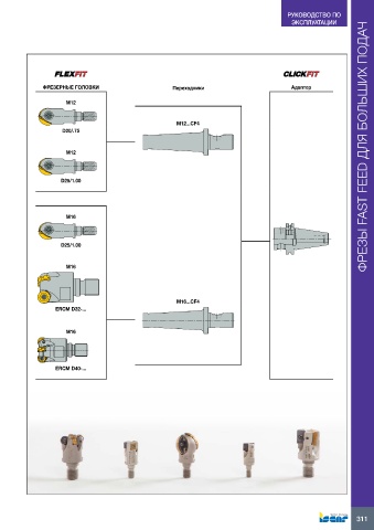 РУКОВОДСТВО ПО ЭКСПЛУАТАЦИИ ФРЕЗЕРНЫЕ ГОЛОВКИ Переходники Адаптер M12 M12...CF4 D20/.75 M12 ФРЕЗЫ FAST FEED ДЛЯ БОЛЬШИХ ПОДАЧ D25/1.00 M16 D25/1.00 M16 M16...CF4 ERCM D32-... M16 ERCM D40-... 311