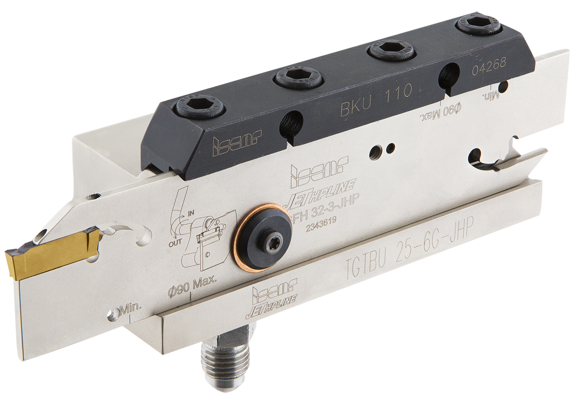 El Refrigerante de Alta Presión (HPC) proporciona ventajas competitivas para un mejor rendimiento de la operación al disminuir las temperaturas en la zona de corte y al garantizar una excelente rotura de virutas, lo que mejora sustancialmente el acabado de la superficie y prolonga la vida útil de la herramienta. En el mecanizado de superaleaciones resistentes al calor difíciles de cortar y acero inoxidable austenítico, HPC reduce o incluso elimina el fenómeno del recrecimiento del filo. El refrigerante de alta presión y bien dirigido es determinante en las operaciones de tronzado y ranurado.